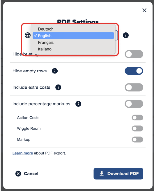 For example, when dealing with an English-speaking client, you can calculate with an English template but display your interface in German. For the client, you can simply change the PDF language before export without having to adjust the interface language.